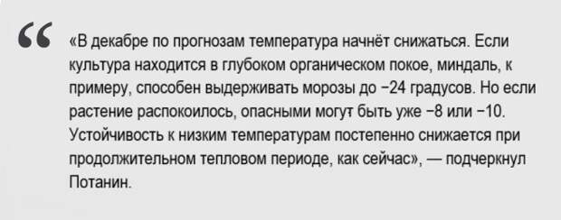 Крымский Гидрометцентр зафиксировал, что средняя температура ноября оказалась почти на пять градусов выше обычной климатической нормы. Такая ситуация привела к серьезным изменениям и представляет угрозу для сельского хозяйства юга России. Как заявил Крымскому информационному агентству доцент кафедры плодоовощеводства и виноградарства Агротехнологической академии Крымского федерального университета Дмитрий Потанин, повышение температуры вызвало необычные процессы у растений, характерные для поздней весны, а не поздней осени.