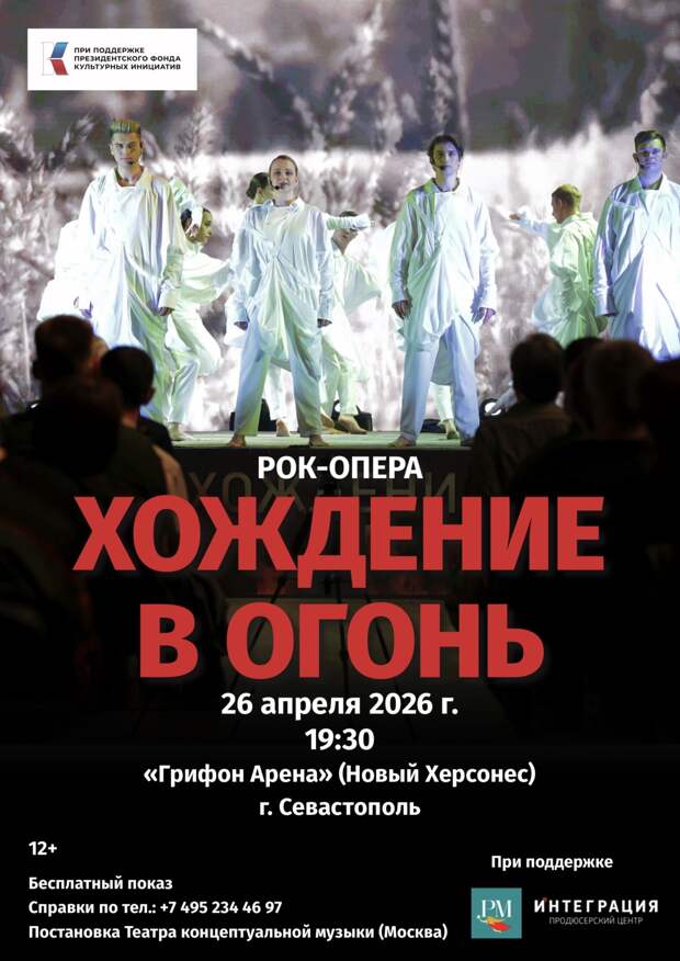Завершит вечер рок-опера «Хождение в Огонь» на стихи Героя Труда России Александра Проханова. Это масштабное сценическое произведение о трагических испытаниях и великих победах Русской Истории уже увидело около 14 тысяч зрителей в 25 городах России. На «Грифон Арене» представят обновленную версию с усиленным звучанием и впечатляющей визуализацией — в сопровождении Крымского камерного оркестра «Новая гармония» под руководством Дениса Карлова.