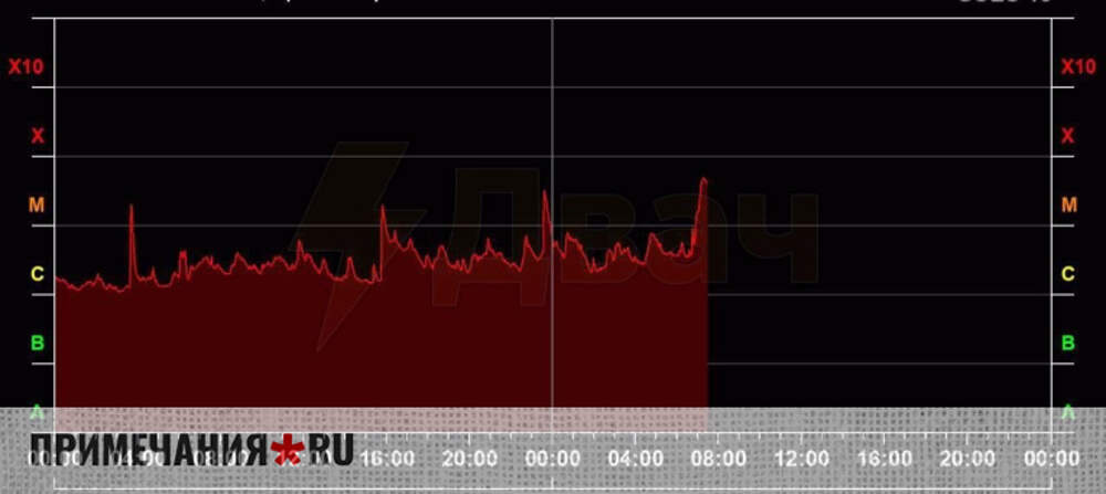 Земля миновала первую волну одной из сильнейших геомагнитных бурь XXI века. Учёные сообщают, что скорость солнечного ветра установилась на отметке 900 км/с, что превышает средние показатели в 2,5–3 раза. Значения индукции магнитного поля вблизи планеты остаются значительно завышенными, примерно в... Далее